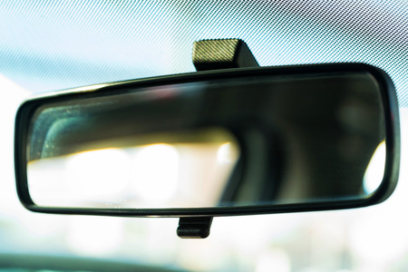 Mirrors, white car. Rear-view mirrors of a new white car with bokeh background.