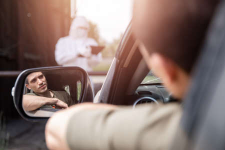 Driver man in protective mask Covid-19 presents ID cards to doctors border between regions. Concept coronavirus car trip