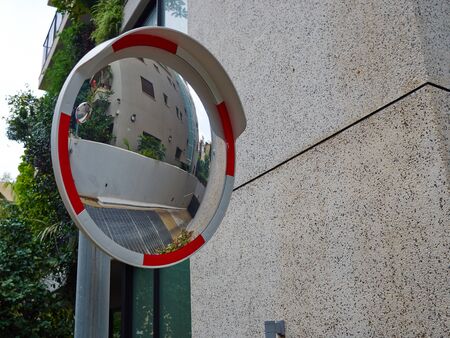 Safety traffic panoramic street mirrorby a building to cover blind area - with space for graphics in the right side