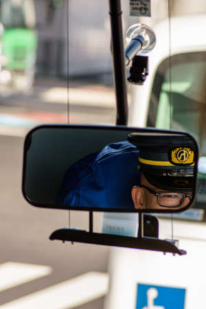 Hiroshima / Japan - December 20, 2017: Bus driver taking a look in the rear view mirror, Hiroshima, Japan