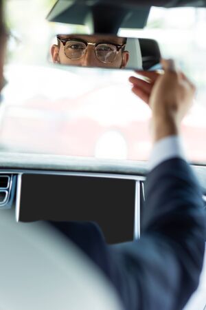 Touching mirror. Handsome young businessman touching rear view mirror before driving