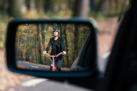 Reflection of young man in side view mirror of car. Concept of Transportation