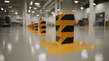 A view of safety barriers painted in yellow and black within a spacious warehouse. The polished concrete floor highlights an organized and safe industrial setting.