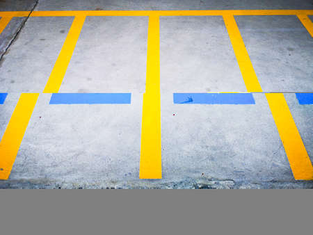Underground parking lot with yellow and blue stripes. Blurred background.
