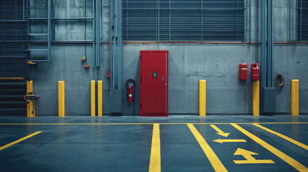 A fire hose cabinet mounted on the wall of a warehouse, with yellow safety lines and emergency exit arrows painted on the floor