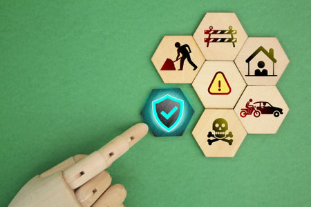 Safety at work concept. Wooden blocks with safety icons.