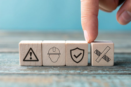 This image features a set of wooden blocks, each displaying a different safety symbol. The symbols include a shield, a person in a hard hat, and another person in a safety vest. The blocks are arranged on a white background, and the image has a transparent background, making it suitable for various design applications. The image is clear and SEO-friendly.