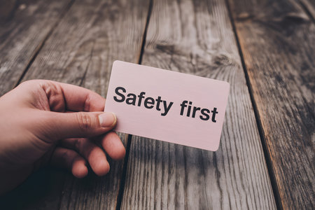 Close-up of a hand holding a light pink card that reads SAFETY FIRST, set against a rustic, weathered wooden background with rich grain patterns.