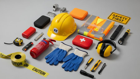 A vibrant arrangement of yellow safety equipment and tools, including a hard hat, gloves, and headphones, designed to emphasize safety in industrial environments.