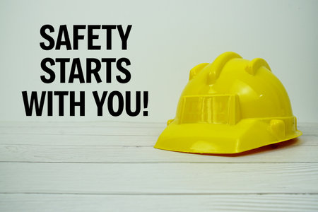 Safety Starts With You! text on blackboard with safety helmet on wooden background