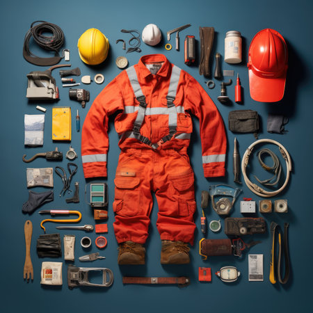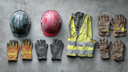 This image showcases an array of essential safety gear including helmets, gloves, and vests on a textured concrete surface, ideal for construction imagery.
