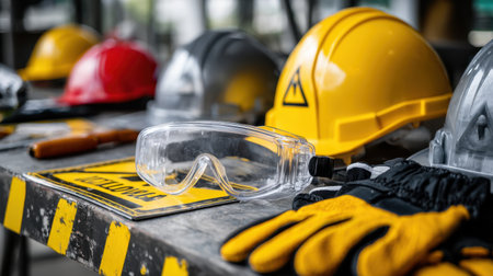 Close-up of essential safety gear including gloves, goggles, a hard hat, and a caution sign on a work surface, emphasizing the importance of workplace safety and protection.