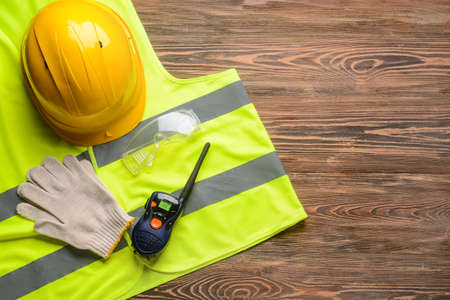 Work safety protection equipment flat lay. Industrial protective gear on wooden table background, top view. Construction site health and safety concept
