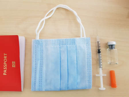 Medical mask, syringe and notebook on wooden background. Coronavirus concept