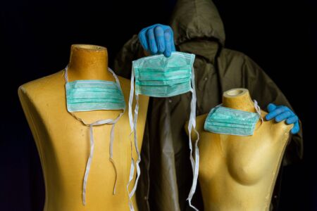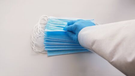 Doctor holding blue surgical medical face mask in two black protective glove in hands Concept on background of lot respiratory bandages for human face with rubber ear straps. Hygiene and health care