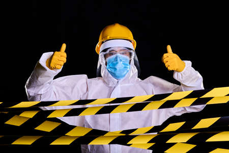 Health worker for virus pandemic surrounded by security tapes with thumbs up on black background