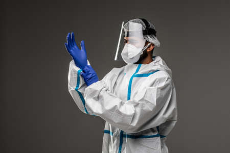Young man in a protective suit. A man shows sterile hands in gloves on a blue background. Protection against virus outbreaks.