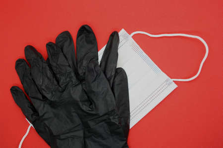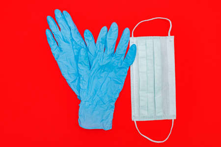 Pair of latex blue medical gloves and surgical ear-loop mask on red background. Protection coronavirus concept
