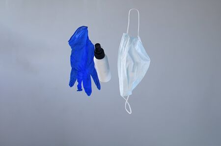 Levitating Epidemic Protective kit, Masks pile, gloves and alcohol hand sanitizer bottle on gray background
