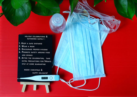 Holiday celebrations and gathering safety guideline concept with red background and personal protective equipment
