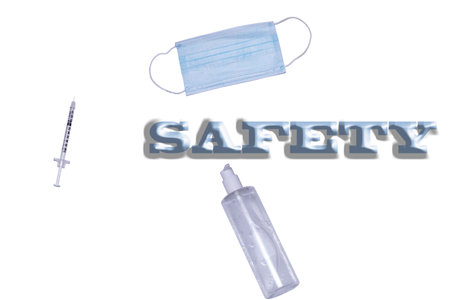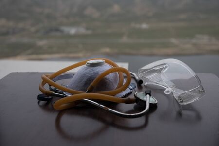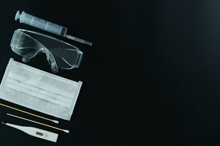 Corona virus medical equipment: Medical masks, safety glasses, syringe, cotton swab, sanitizer and thermometer with petri dish on the table. Coronavirus, Covid-19 protection.