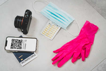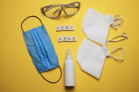 protective medical mask, sanitizer gel and gloves. protective measures against virus, bacteria
