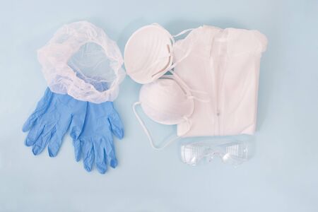 dust mask, blue gloves, protective suit and head cover isolated on a light blue background.