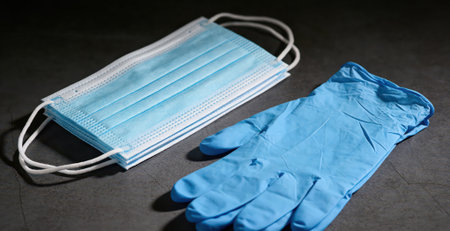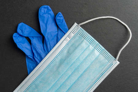 Medical protective mask and nitrile blue gloves on gray stone background. Protective hygiene kit. Coronavirus prevention concept