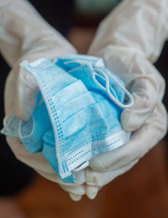 hand in rubber glove holding used disposable surgical mask on a background of other face masks. Medical trash after coronavirus pandemic. End of quarantine.