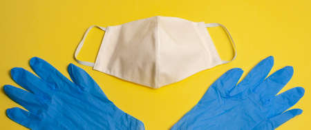 Protective equipment kit against pandemic, coronavirus, covid19 closeup, top view. White, medical, tissue, cotton, hygiene face mask and blue gloves on yellow background, isolated Banner for web site