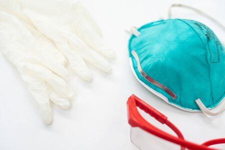 White FFP2, N95 respirator with goggles and latex gloves on a white table.