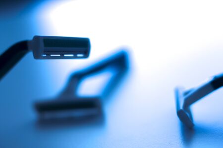 Detail close-up razor blade and other blades at the bottom on a background of bluish colors