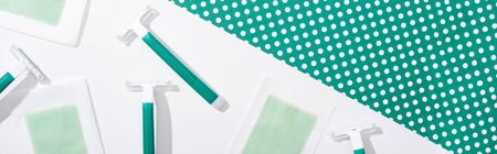 top view of green disposable razors and depilation wax stripes on green and white dotted background, panoramic shot