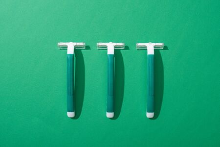 flat lay with green disposable razors on green background