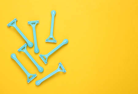 Set of disposable razors for depilation on yellow background.