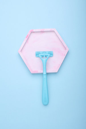 A single use shaving razor on blue background. View from above