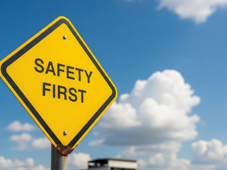 A yellow warning sign with safety first text against blue sky