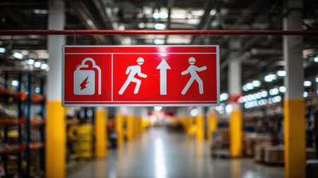 Emergency evacuation sign in a warehouse showing escape route for workers with safety precautions in industrial setting and clear visual indicators for safety