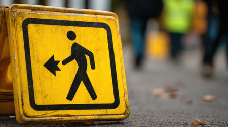 A bright yellow caution sign directs pedestrians to walk left, set against an urban backdrop with blurred figures, emphasizing safety and movement in public spaces.