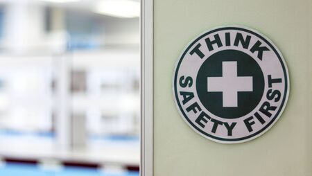 The safety sign on the open door room with bench laboratory and experiment in medical service room, feeling clean good health care, use as a medical science background. Think safety first caution tag.