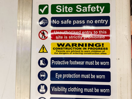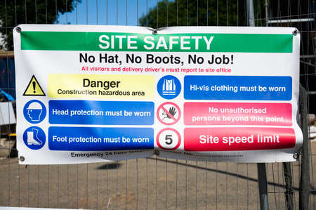Construction site health and safety message rules sign board signage on fence boundary