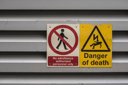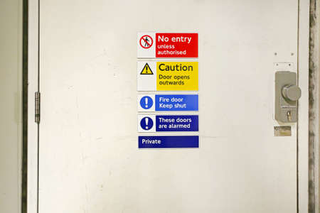 Safety signs on a green door for warning