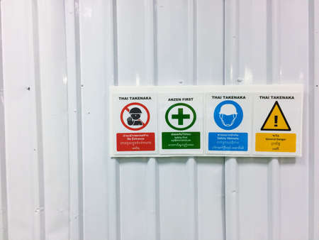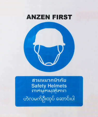 Warning Sign, No entrance, Safety first, Safety helmets, General danger. Include English language,Thai Language, Burmese Language, Lao language. white background. Construction area.