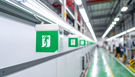 Emergency evacuation sign in a warehouse showing escape route for workers with safety precautions in industrial setting and clear visual indicators for safety