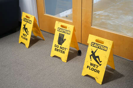 slippery when wet sign inside the office building