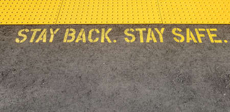 yellow sign at train station asking people to stay back, stay safe, on concrete floor, ontario, Canada