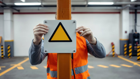 Worker in a safety vest holding a yellow warning triangle sign.