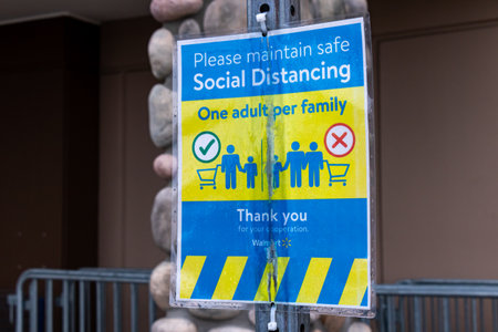 Bucharest, Romania - June 6, 2020: Poster indicating 2 meters social distancing is mandatory is displayed at the entry into a store, to mitigate the spread of the Coronavirus (COVID-19) outbreak