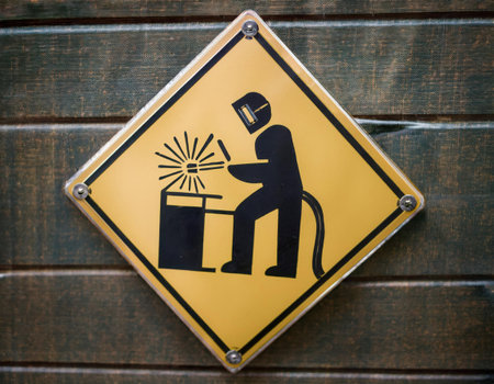 A warning sign is mounted on a wooden wall, showing a welder working at a bench while sparks are flying, emphasizing safety in the workplace.