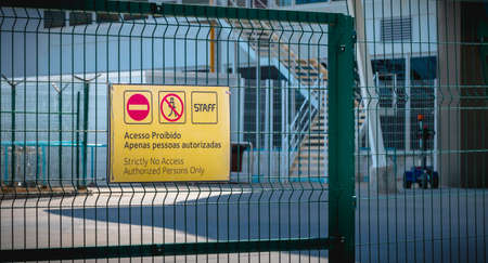 Faro, Portugal - May 3, 2018: Strictly No Access Authorized Persons Only (Acesso Proibido Apenas Pessoas autorizadas) sign in front of Faro International Airport on a spring day